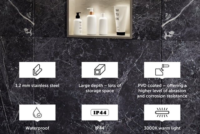 Shower Niche’s offer something different to your bathroom, easy storage and elegance. With the pre lit niche’s installations never been easier offering a warm lighting touch to your shower.
