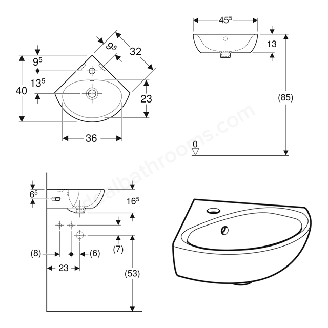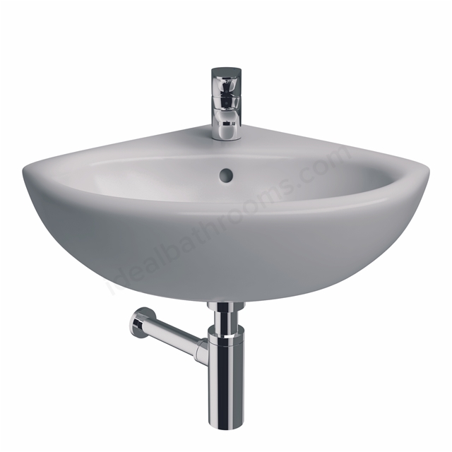 Key Features:• Corner installation – designed specifically to save space in compact rooms• Compatible with full pedestal – for extra support or aesthetic finish• Durable vitreous china – hard-wearing, hygienic, and easy to clean• Overflow & tap hole included – centred, visible, and symmetrical