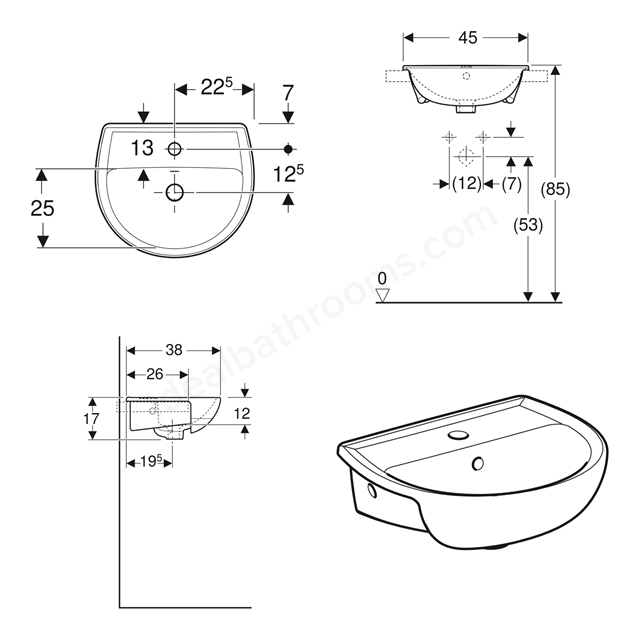 This Twyford Alcona 450mmW Semi-Recessed Basin is a sleek, space-efficient washbasin designed to fit seamlessly into vanity units and countertop installations.