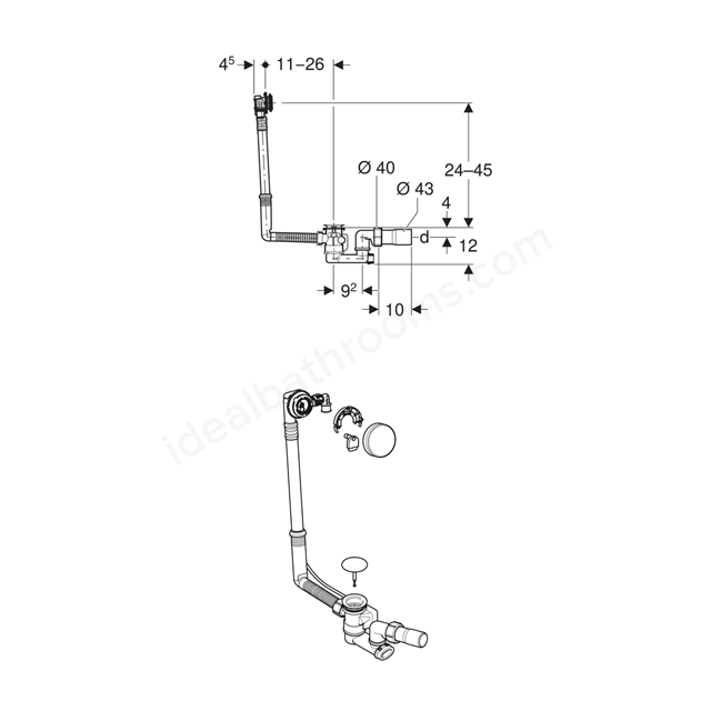 Suitable for steel, plastic, and cast-iron baths, it has an integrated inlet for fast filling, a turn handle and a 50mm water seal trap.