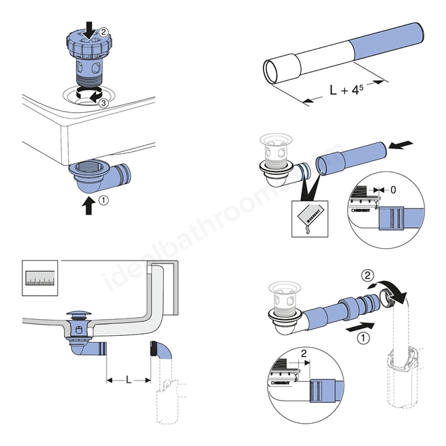 Manufactured to EN 274-3 standards, it includes a chrome-plated brass external waste plug with push actuation, an integrated hair trap, and adjustable pipe lengths.