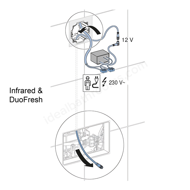 Supplied with a 1.8 m pre-terminated cable, it enables concealed power delivery inside Geberit cisterns and installation frames.